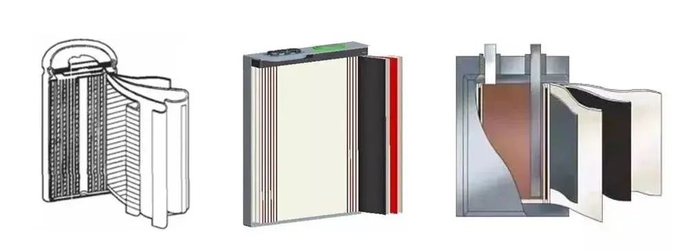 左-圆锥形锂锂电池 中-方壳锂锂电池 右-软包墙面锂锂电池